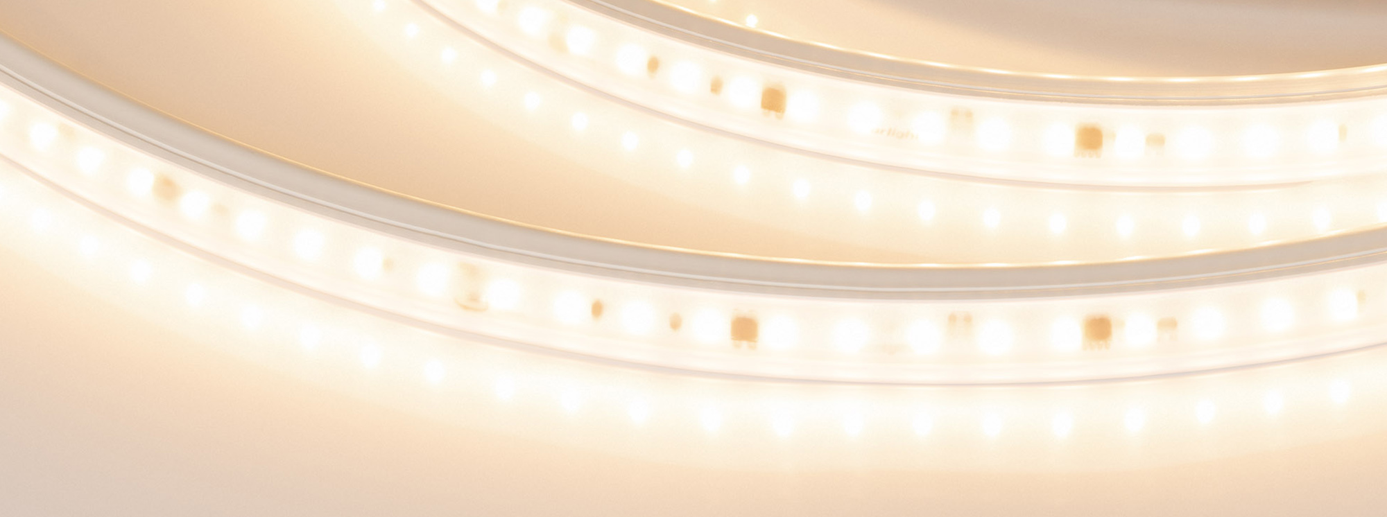 Светодиодная герметичная лента ARL серии A84 со степенью защиты IP65, защитная оболочка из ПВХ устойчива к УФ излучению. Высокий индекс цветопередачи CRI>85 обеспечивает точное восприятие цветовых оттенков. Лента подключается непосредственно к сети переменного тока 230 В и не требует использования источников питания. Наличие интегральных стабилизаторов тока позволяет подключать ленту длиной до 50 м, обеспечивая при этом равномерную яркость свечения по всей длине ленты. При подключении нескольких лент необходимо подавать питание на каждые 50 м отдельным кабелем, последовательное подключение лент более 50 м запрещается. Лента применяется для декоративной подсветки помещений, потолочных ниш, создания контуров рекламных объектов внутри помещений. Ленты обладают низким коэффициентом пульсаций FlickerFree <2%. Для расчета потребляемой мощности необходимо учитывать коэффициент мощности - PF>0.75. На лентах установлены микросхемы с функцией снижения тока для защиты ленты от перегрева, обеспечивающие надежную работу в различных условиях. Диммирование в диапазоне 30%-90% осуществляется TRIAC диммерами с установкой минимального уровня яркости, при диммировании коэффициент пульсаций увеличивается. Крепление с помощью скоб, аксессуары для монтажа и подключения поставляются отдельно.