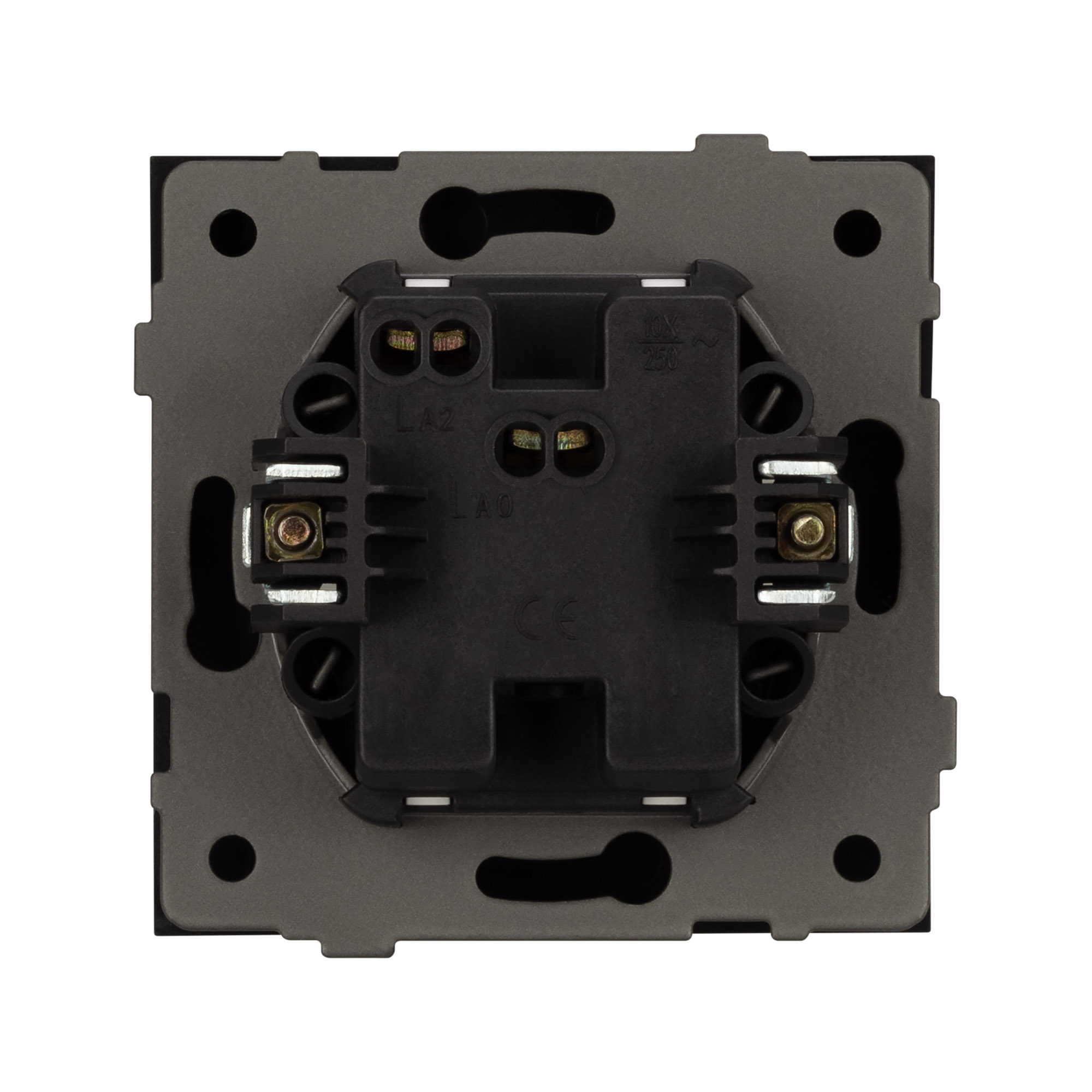 Механизм выключателя света совместим с рамками серии TENDO, создает утонченный минималистичный вид. Скрытый тип монтажа позволяет гармонично встроить в интерьер любого современного дизайн-проекта. Видимая часть механизма выполнена из высококачественного пластика черного цвета и имеет матовое покрытие. Контактная часть присоединяется при помощи винтовых зажимов, позволяя надежно подсоединить механизм выключателя к питающим элементам. А усиленные распорные лапки двойного захвата надежно фиксируют механизм в установочном подрозетнике круглого сечения диаметром 60мм. Суппорт окрашен порошковой краской и выполнен из металла толщиной 1,5мм, что обеспечивает безопасность и уверенность в установке. На каждой стороне суппорта размещены фиксирующие элементы, позволяющие комбинировать механизмы в системы до 5 шт как горизонтально, так и вертикально.