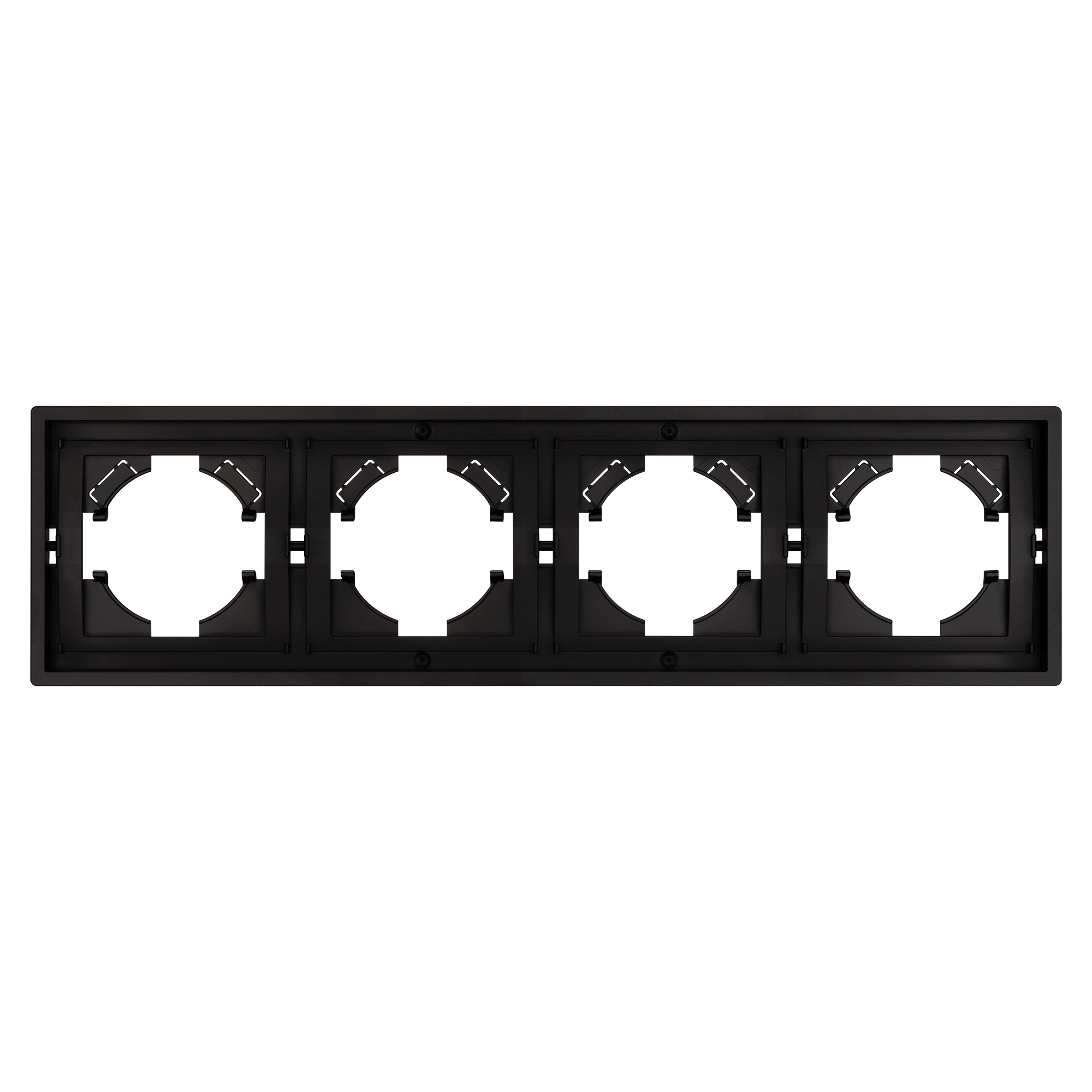 Рамка пластиковая на 4 поста, под встраиваемый механизм. Цвет - черный. Среднего уровня герметичности IP20. Ориентация монтажа горизонтальная.
