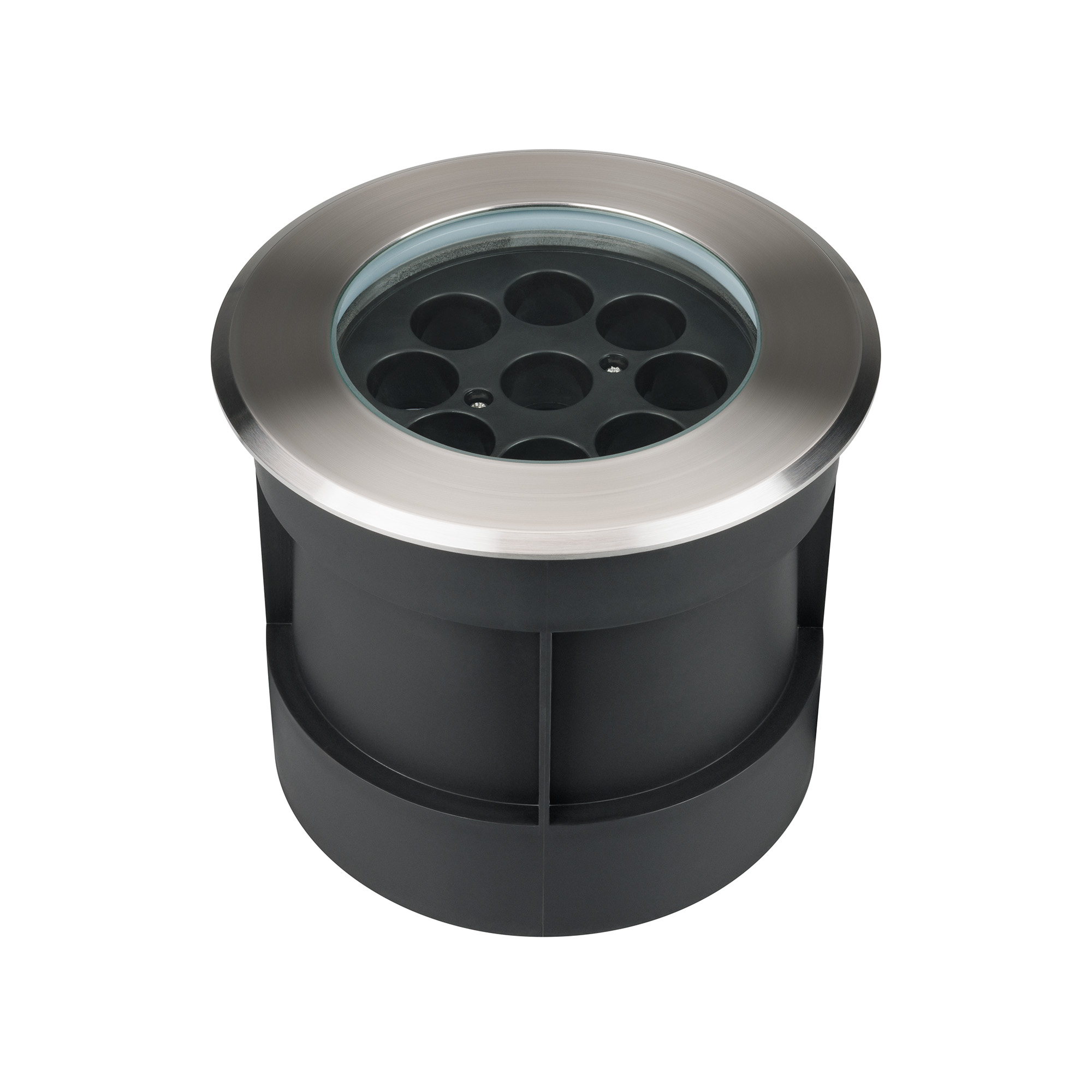 Встраиваемый светодиодный светильник для грунта и пола. Мощность 16Вт, световой поток 1440 лм, цвет теплый 3000К. CRI(Ra)>80, угол 20°. Круглый влагозащищенный корпус IP67, нержавеющая сталь. Экран закалённое стекло. Питание 230В, 16Вт. Размер DxH Ø160x135мм. Установка в отверстие DxH Ø146x130мм.