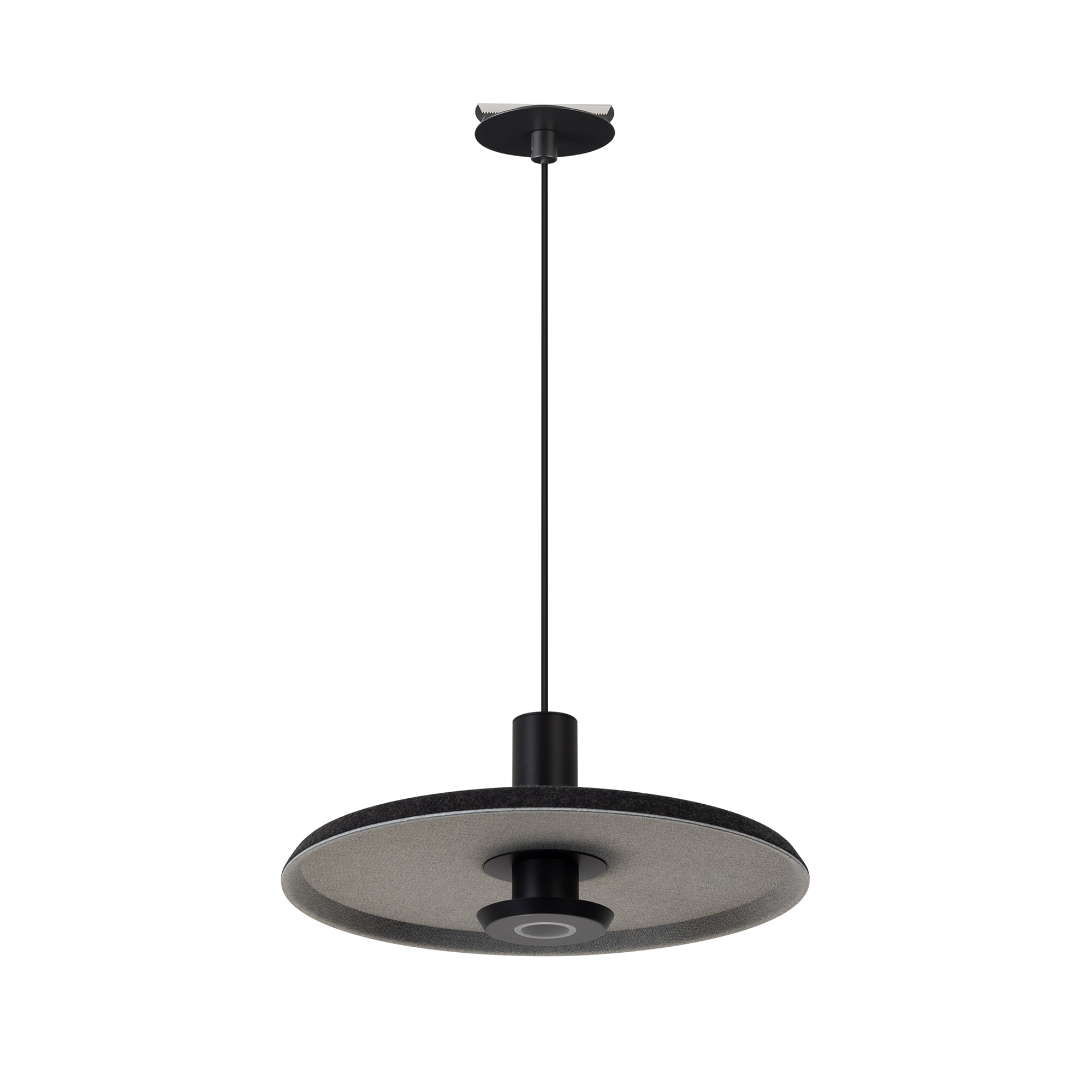 Подвесной светильник. Мощность 12 Вт, св. поток 597 лм, 49 лм/Вт, теплый 2700 K, CRI>94, угол 36°, напряжение питания 230 В. Темно-серый фигурный корпус из переработанного фетра с светло-серой внутренней поверхностью, линза-рассеиватель из PMMA, степень защиты IP20. Размер: диаметр 350 мм, высота 145 мм. Монтаж подвесной, длина подвеса 2000 мм, регулируемая. В комплекте 2 вида чаш. Габариты чаши (встраиваемая) Ø80 х 23 мм, врезное отверстие Ø60 мм. Габариты чаши (накладная) Ø120 x 35 мм. Драйвер 59 В, 300 мА, пульсация <1%. Управление по TRIAC.
