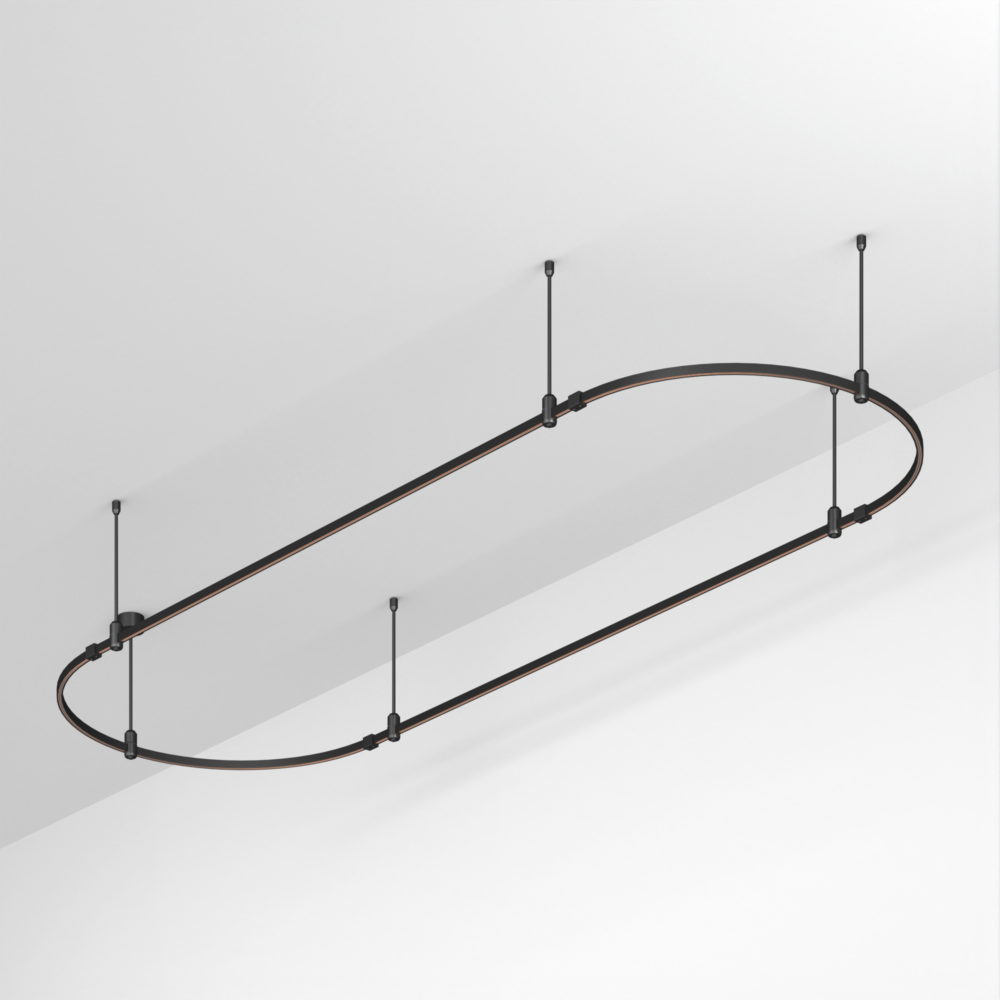 Подвесная конструкция APRIORI, форма овал. В комплекте треки с аксессуарами и жесткими подвесами длиной 400мм. DC48V. Материал алюминий, цвет черный. Размер ДxШxВ: 3000x1000x22мм. Светильники и источники питания приобретаются отдельно.